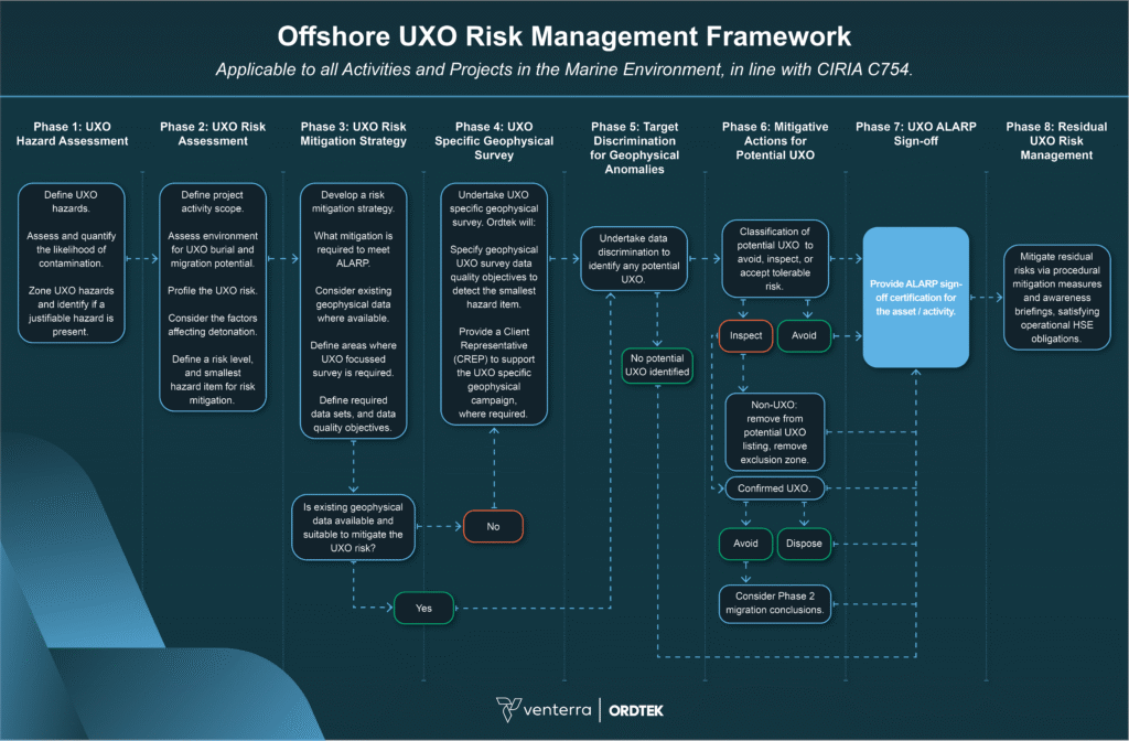 UXO presents a potential risk to the development and continued operation of offshore projects, principally due to contamination from minefields, naval conflicts, aerial bombing, military shipwrecks, military training, and the dumping of munitions/explosives.